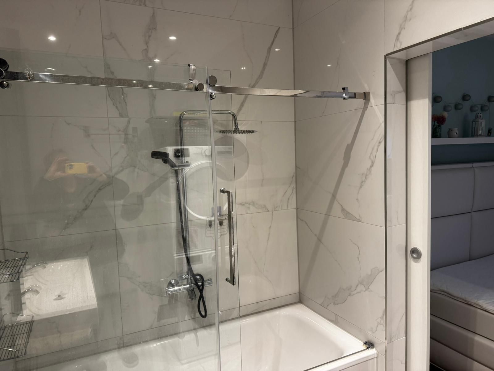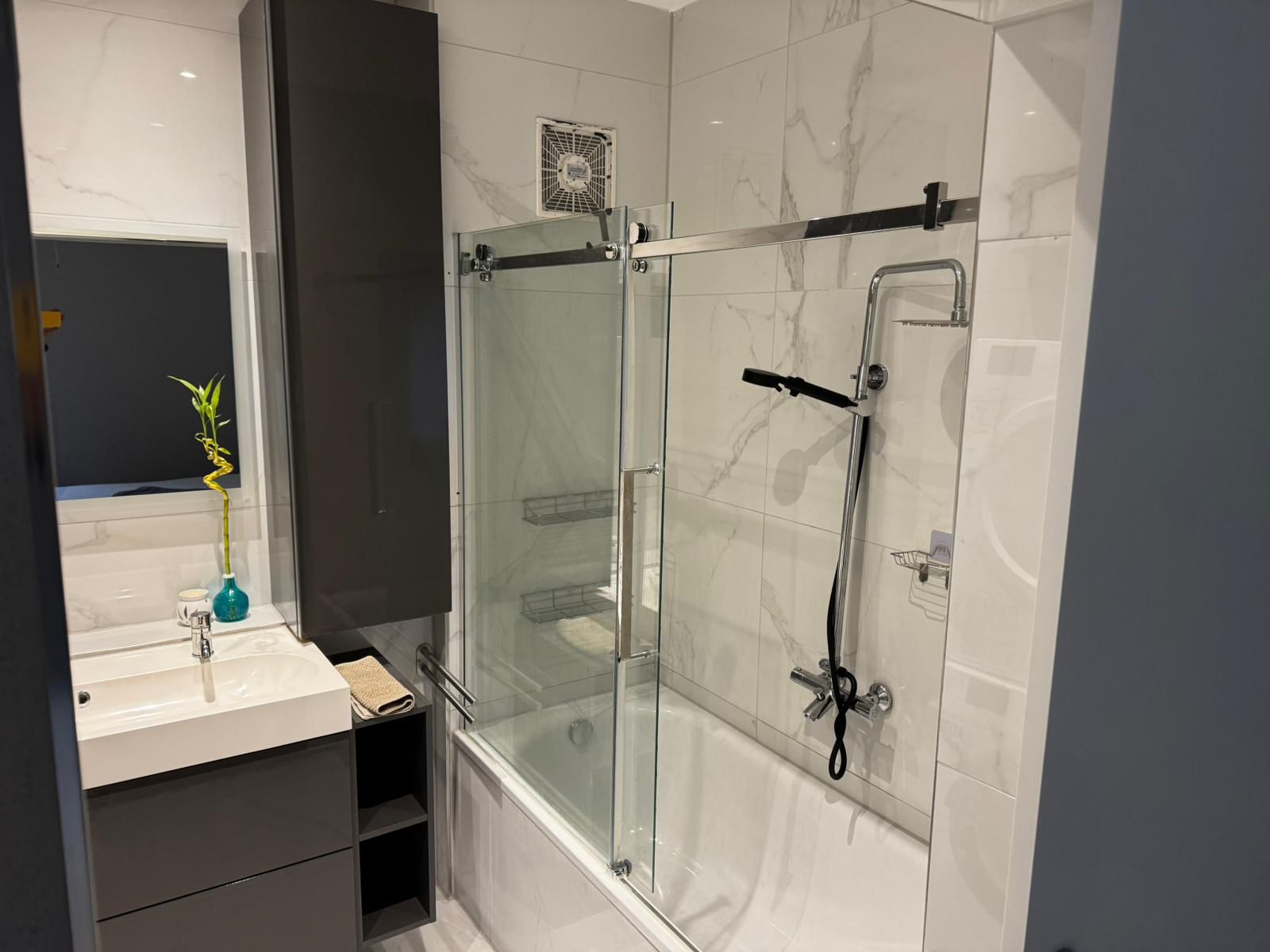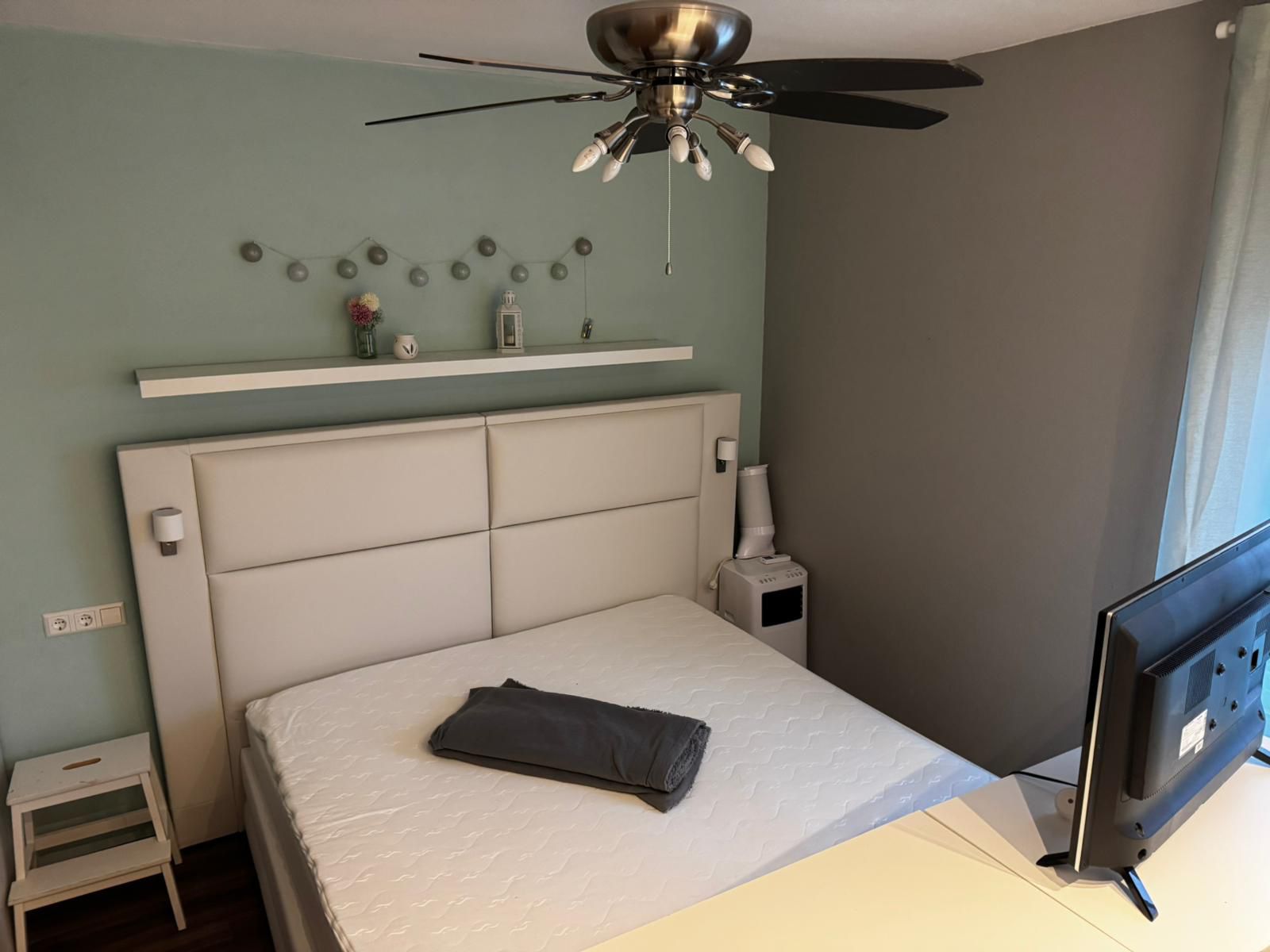 Im vorderen Bereich befinden sich ein separates Gäste-WC sowie das vollverflieste Badezimmer mit Badewanne. Das Schlafzimmer bietet neben dem Schlafbereich auch Platz für einen kleinen Arbeitsplatz und eignet sich damit ideal für Homeoffice.