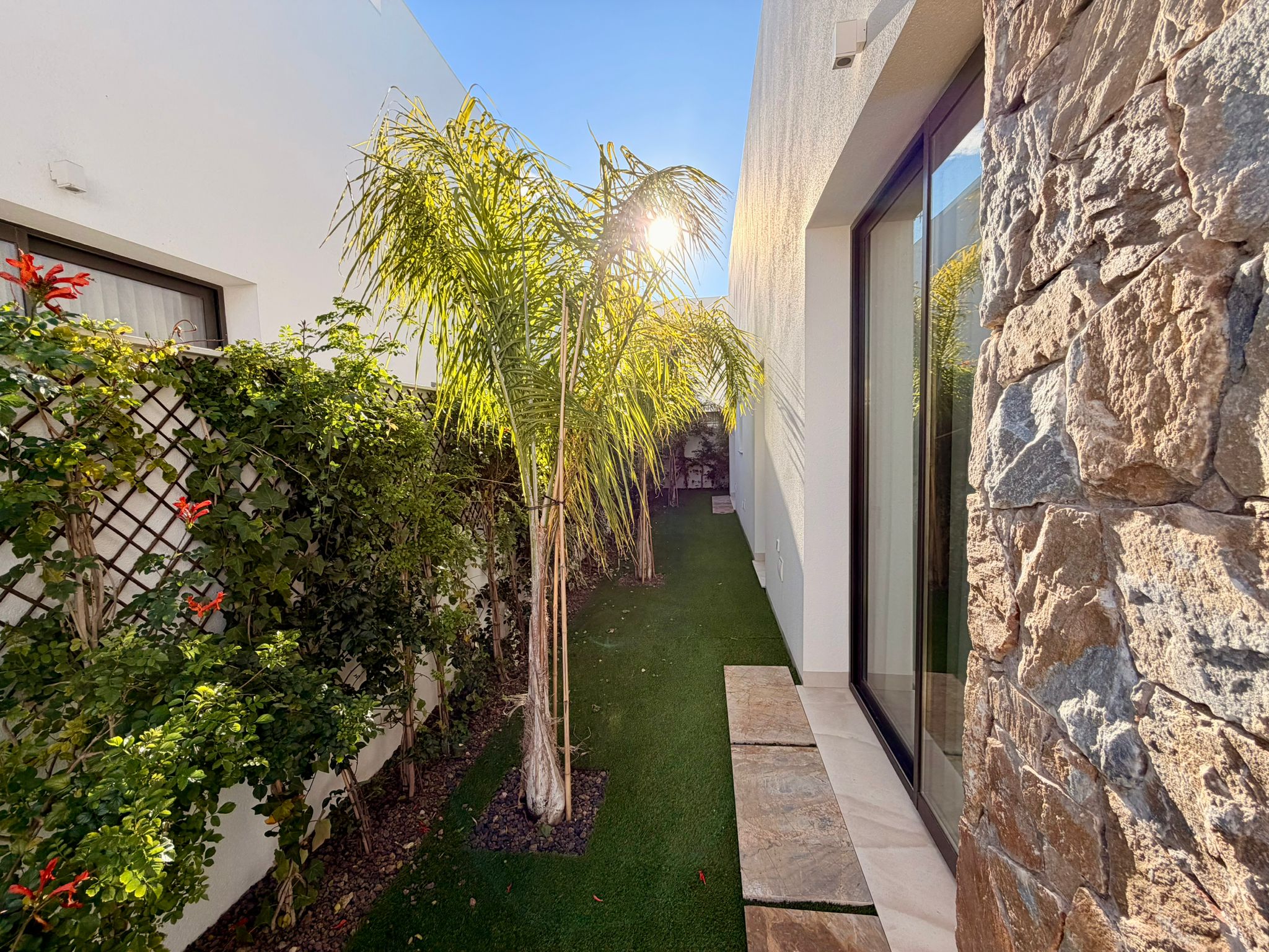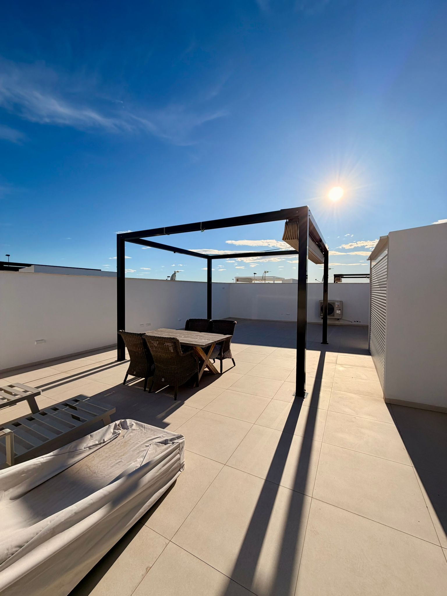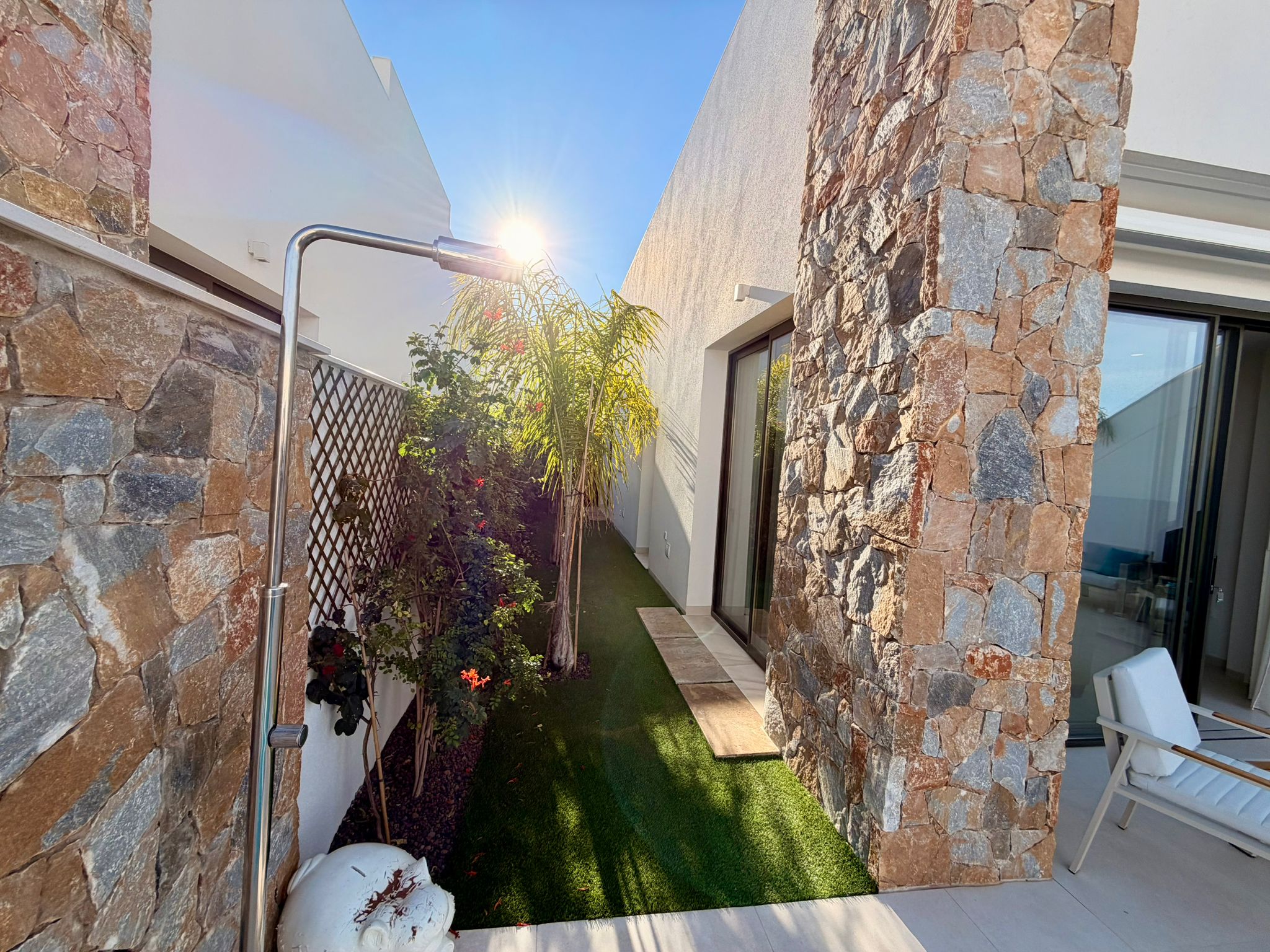 Der Außenbereich überzeugt mit einem privaten Garten, eigenem Pool und großzügigen Terrassenflächen. Besonders hervorzuheben ist die sonnige Dachterrasse mit Blick auf das Mar Menor – ideal für entspannte Stunden und gesellige Abende.