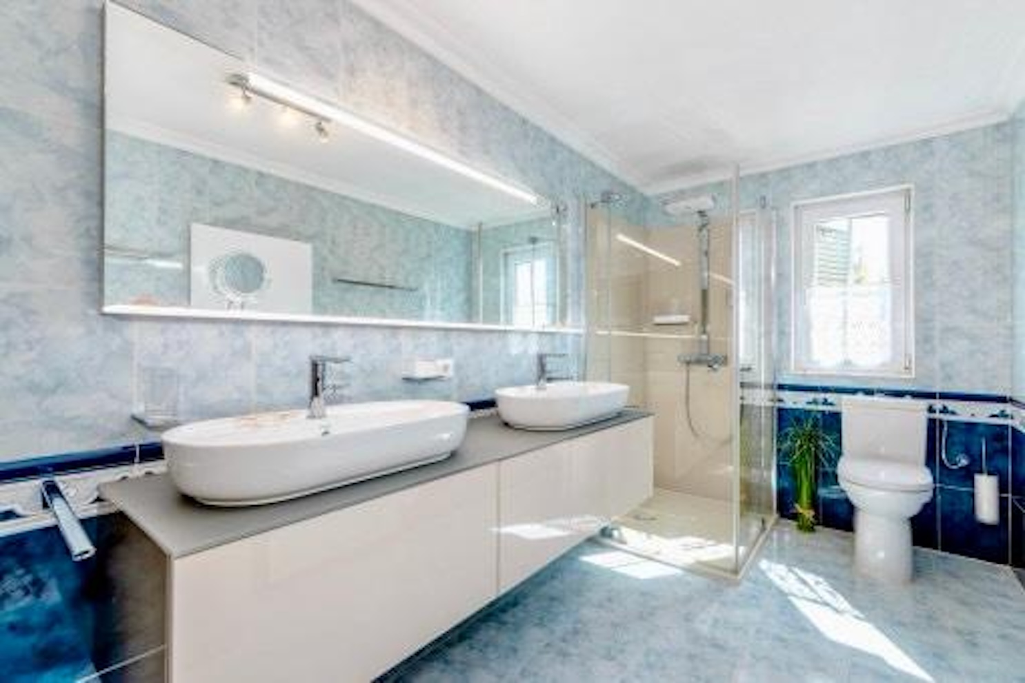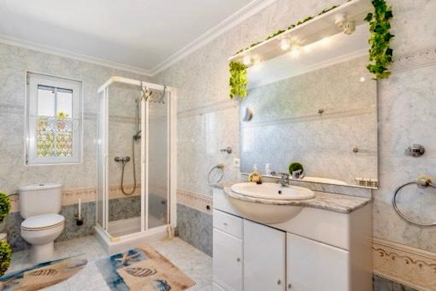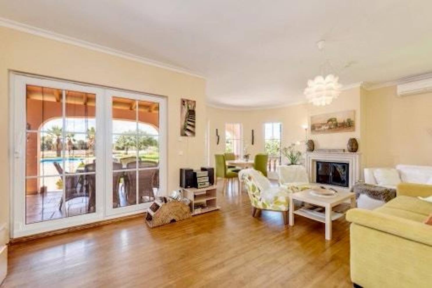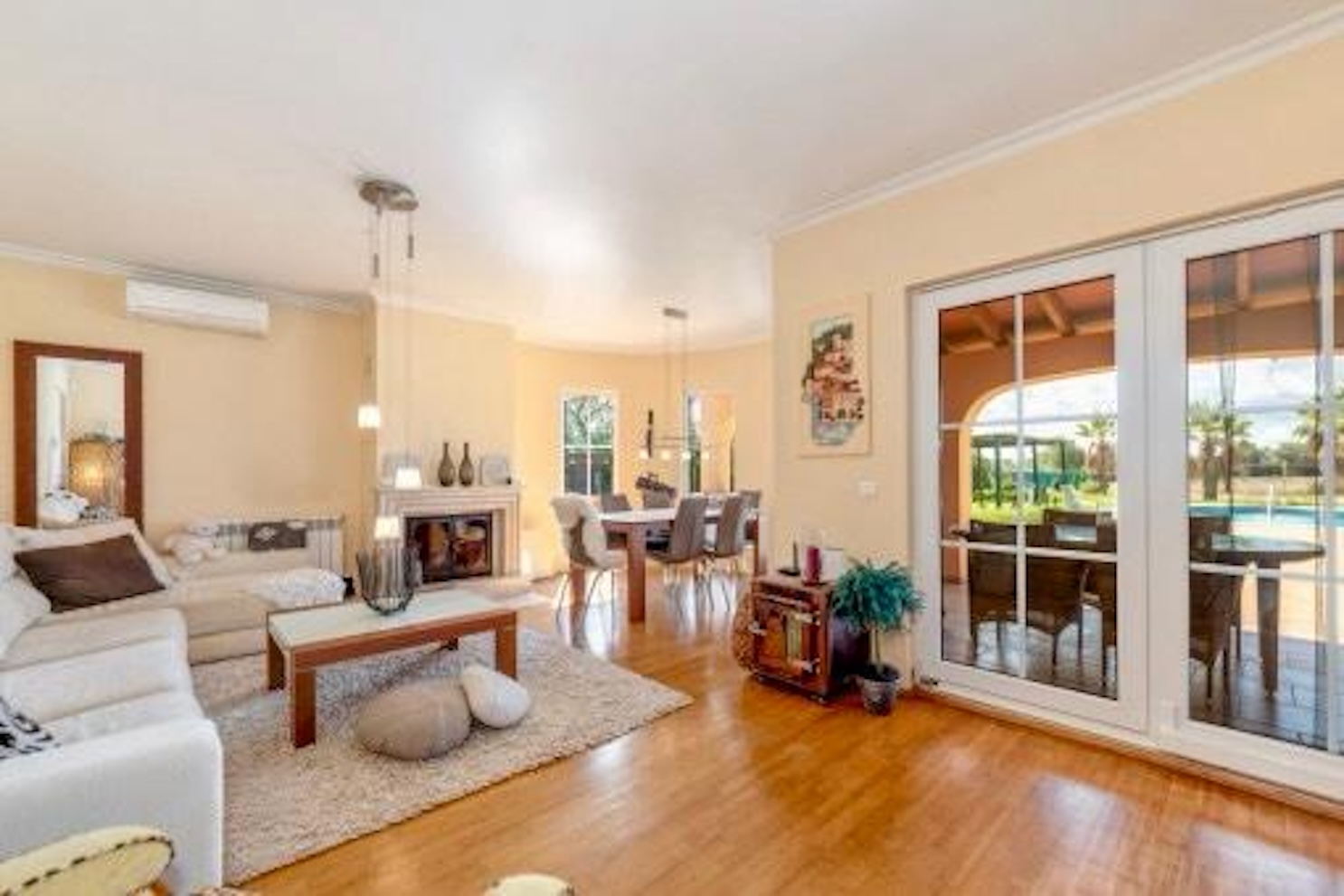 Auf ca. 184 m² Wohnfläche bietet die Immobilie zwei separate Bereiche mit jeweils Schlafzimmer, Bad, Küche und Wohn-/Essbereich mit Kamin. Eine weitere Nutzungsmöglichkeit für ein zusätzliches Zimmer besteht. Die Finca ist teilweise mit Parkett und Fliesen ausgestattet, verfügt über Heiß-/Kalt-Klimaanlage, Ölzentralheizung und isolierte Fenster und wird komplett möbliert übergeben.