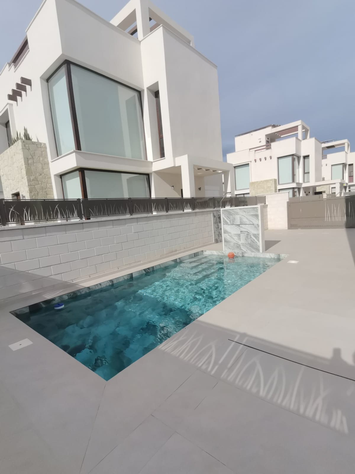 Diese moderne Villa bietet auf 109 m² Wohnfläche ein offenes, lichtdurchflutetes Raumkonzept mit drei Schlafzimmern und drei Bädern. Bodentiefe Fenster sorgen für ein helles Ambiente, während das 132 m² große Grundstück mit privatem Pool, angelegten Terrassenflächen und einer großzügigen Dachterrasse ein exklusives Wohnerlebnis bietet.